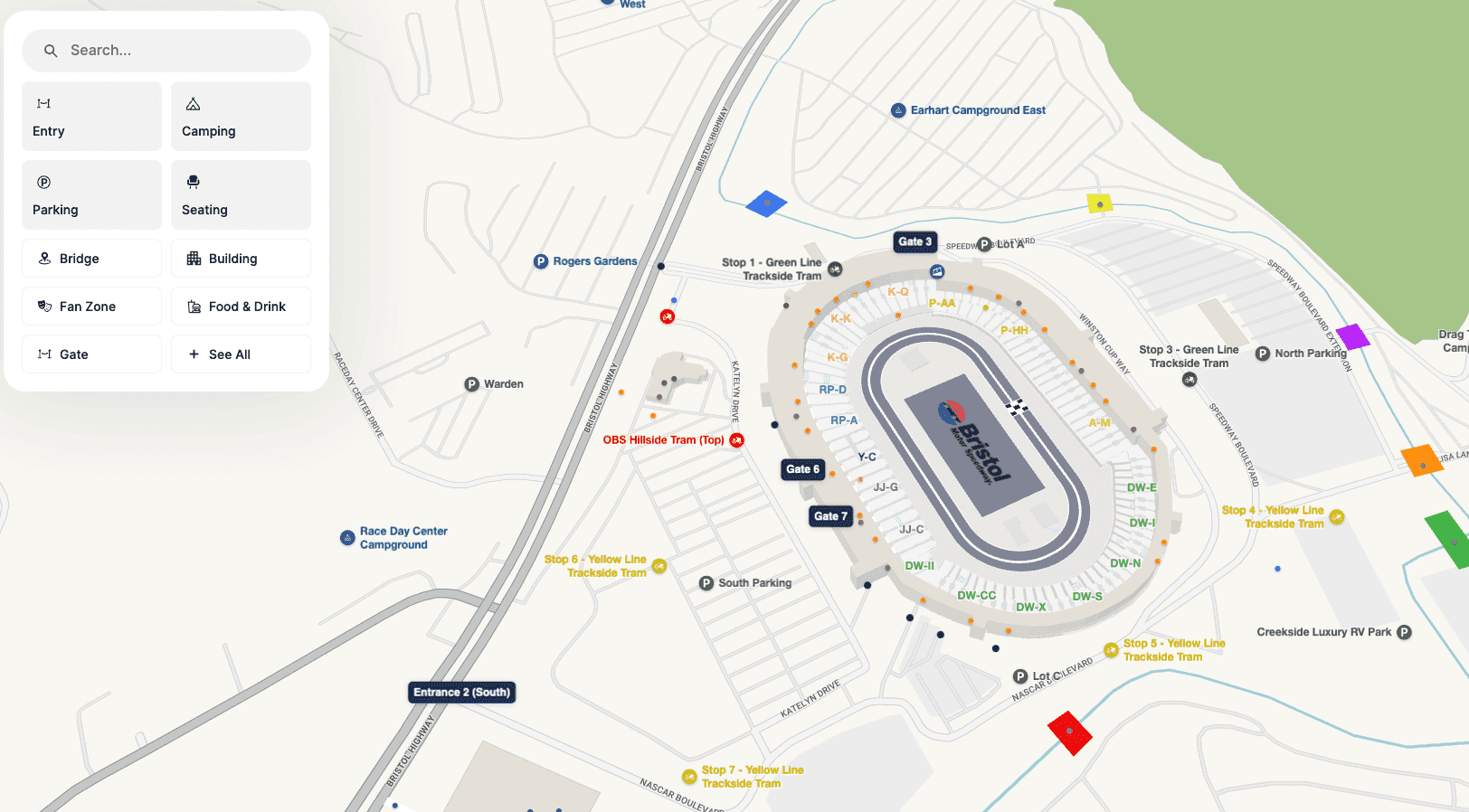 A venue with 160,000 seats, 200 suites, infield camping, and a separate drag strip doesn't navigate itself. Bristol's grandstand sections mean finding the right gate requires more than a section number. Fans need to know: